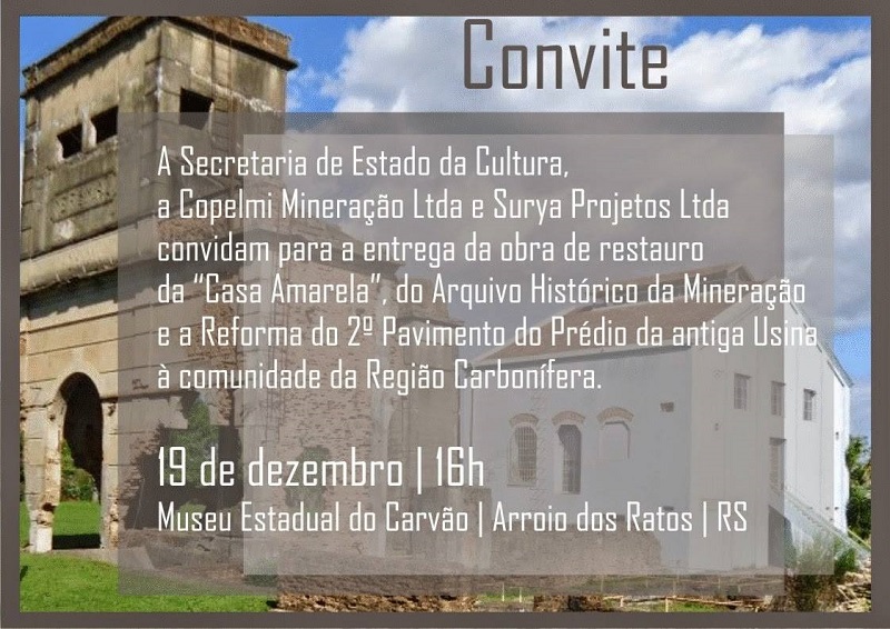O Museu Estadual do Carvão, localizado em Arroio dos Ratos, entregará, na 6ª feira, 19 de dezembro, as obras de restauro de parte dos prédios de seu complexo histórico, desenvolvidas no período de 2011 a 2014.