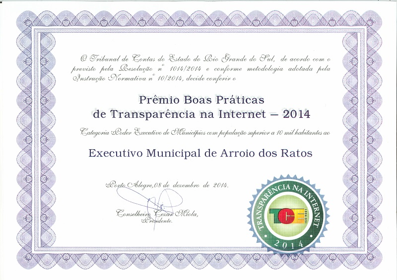 A Prefeitura de Arroio dos Ratos foi uma das contempladas pelo Tribunal de Contas do Estado do Rio Grande do Sul (TCE/RS), com o “Prêmio Boas Práticas de Transparência na Internet”, na categoria Poder Executivo de Municípios com População Superior a 10 mil habitantes.